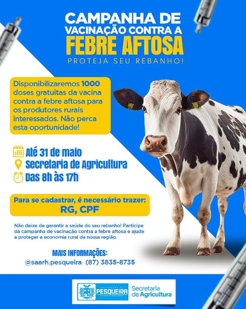 A Prefeitura de Pesqueira, através da Secretaria de Agricultura vai disponibilizar 1000 doses gratuitas da vacina contra a febre aftosa para os produtores rurais interessados. Não perca esta oportunidade!
