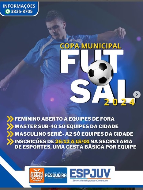 A Prefeitura Municipal de Pesqueira através da secretaria de Esportes e Juventude realizará no próximo ano a 2º Copa Municipal de Futsal nas categorias masculino série-A1 e série-A2, feminino aberto e master masculino sub-40.