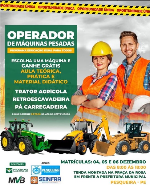 A Prefeitura de Pesqueira junto com vários parceiros vai realizar o curso de Operador de Máquinas Pesadas, que faz parte do programa Educação Igual para Todos.