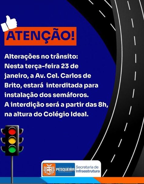 Nesta terça-feira, 23 de janeiro, a Av. Cel. Carlos de Brito, estará interditada para instalação dos semáforos.