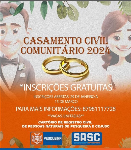 A Prefeitura de Pesqueira através da Secretaria de Assistência Social e em parceria com o Cartório de Registro Civil de Pessoas Naturais de Pesqueira e CEJUSC abre inscrições para mais um casamento coletivo.