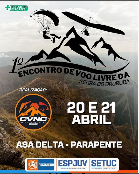 No dia 20 de abril, o Clube Vela na Cabeça em parceria com a Prefeitura Municipal de Pesqueira e as Secretarias de Esportes e Turismo irão promover o 1º Encontro de Voo Livre da Serra do Ororubá