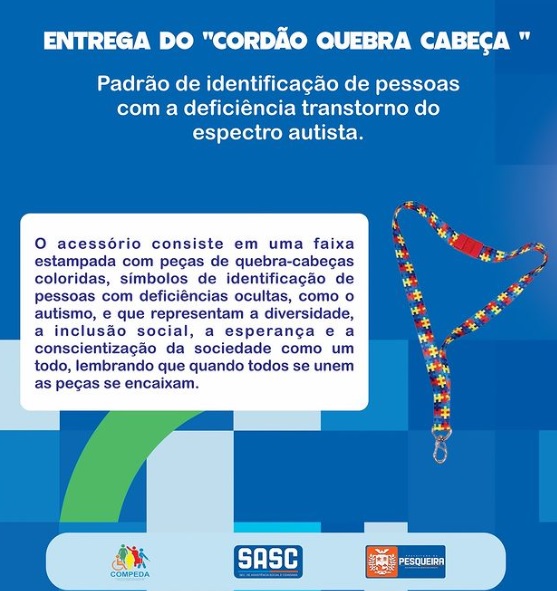 Durante o mês de abril, a Secretaria de Assistência Social de Pesqueira em parceria com o Conselho Municipal da Pessoa com Deficiência e da Pessoa com Autismo (COMPEDA), irá realizar entregas de cordões quebra-cabeça.A entrega de cordões de identificação é destinada a pessoas com diagnóstico de transtorno do espectro autista (TEA).