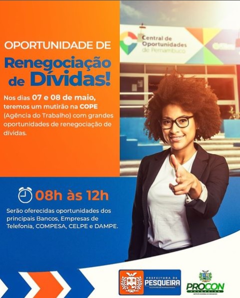 Nos dias 07 e 08 de maio, teremos um mutirão na COPE (Agência do Trabalho) com grandes oportunidades de renegociação de dívidas.