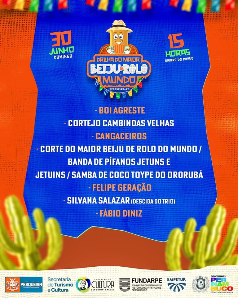 Pelo terceiro ano consecutivo, o Maior Beiju de Rolo do Mundo, vai acontecer em Pesqueira, no Agreste. A iniciativa já é tradição no interior por valorizar uma iguaria, que nasceu no Território Xukuru do Ororubá. Este ano, entre as atrações confirmadas estão Silvana Salazar, Felipe Geração e Fábio Diniz.