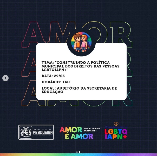 No dia 29 de junho, a Prefeitura de Pesqueira, através da Coordenadoria LGBTQIA+ vai realizar, no Auditório da Secretaria de Educação, o 1º Seminário LGBTQIAPN+ do município.