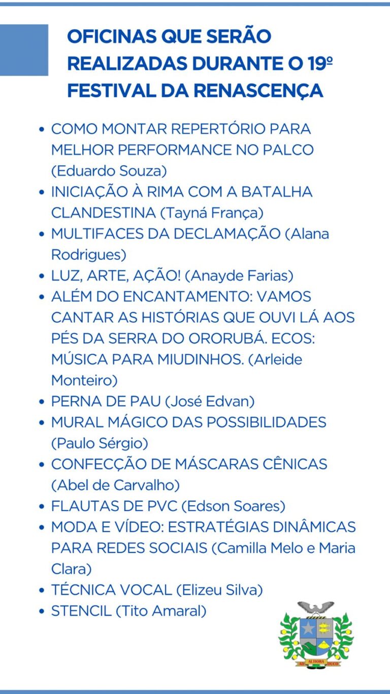 Atenção! Abertas inscrições para as oficinas do 19º Festival da Renascença 2024 – PE Meu País.