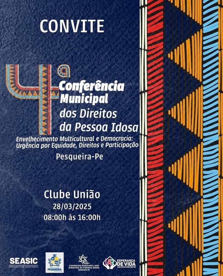 O Conselho Municipal dos Direitos da Pessoa Idosa de Pesqueira/PE e a Secretaria Municipal de Inclusão Social e Cidadania convidam toda a população para a 4ª Conferência Municipal dos Direitos da Pessoa Idosa!