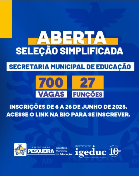 Já estão abertas as inscrições para a Seleção Simplificada da Secretaria de Educação de Pesqueira.