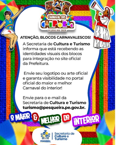 A Secretaria de Cultura e Turismo de Pesqueira informa que os blocos interessados em participar do Carnaval 2025 devem enviar suas identidades visuais para integração ao site oficial da Prefeitura.