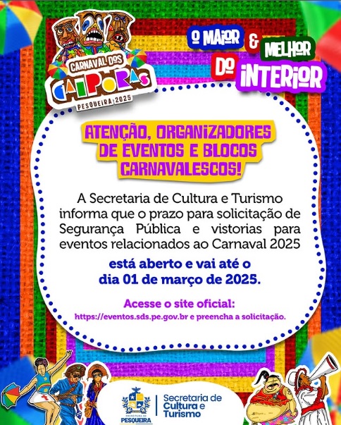 A Secretaria de Cultura e Turismo informa que o prazo para solicitação de Segurança Pública e vistorias para eventos relacionados ao Carnaval 2025 está aberto e vai até o dia 01 de março de 2025.