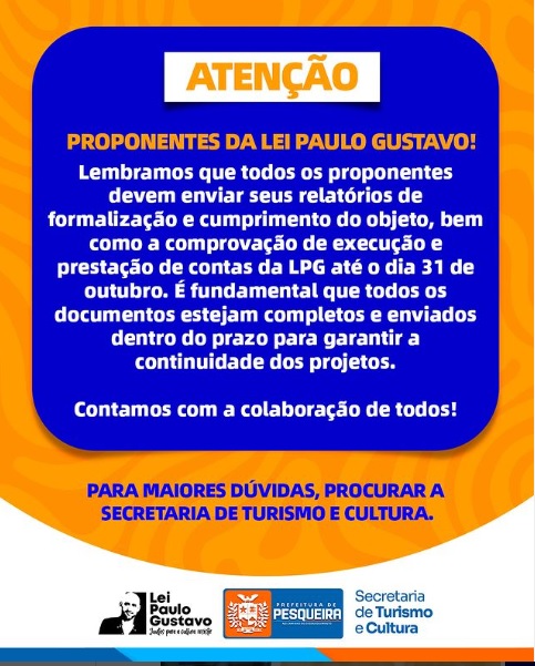 Lembramos que todos os proponentes devem enviar seus relatórios de formalização e cumprimento do objeto, bem como a comprovação de execução e prestação de contas da LPG até o dia 31 de outubro. É fundamental que todos os documentos estejam completos e enviados dentro do prazo para garantir a continuidade dos projetos.