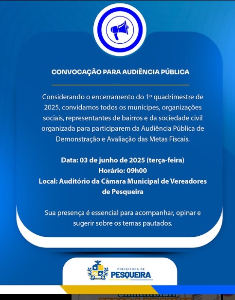 📍 Local: Auditório da Câmara Municipal de Vereadores de Pesqueira