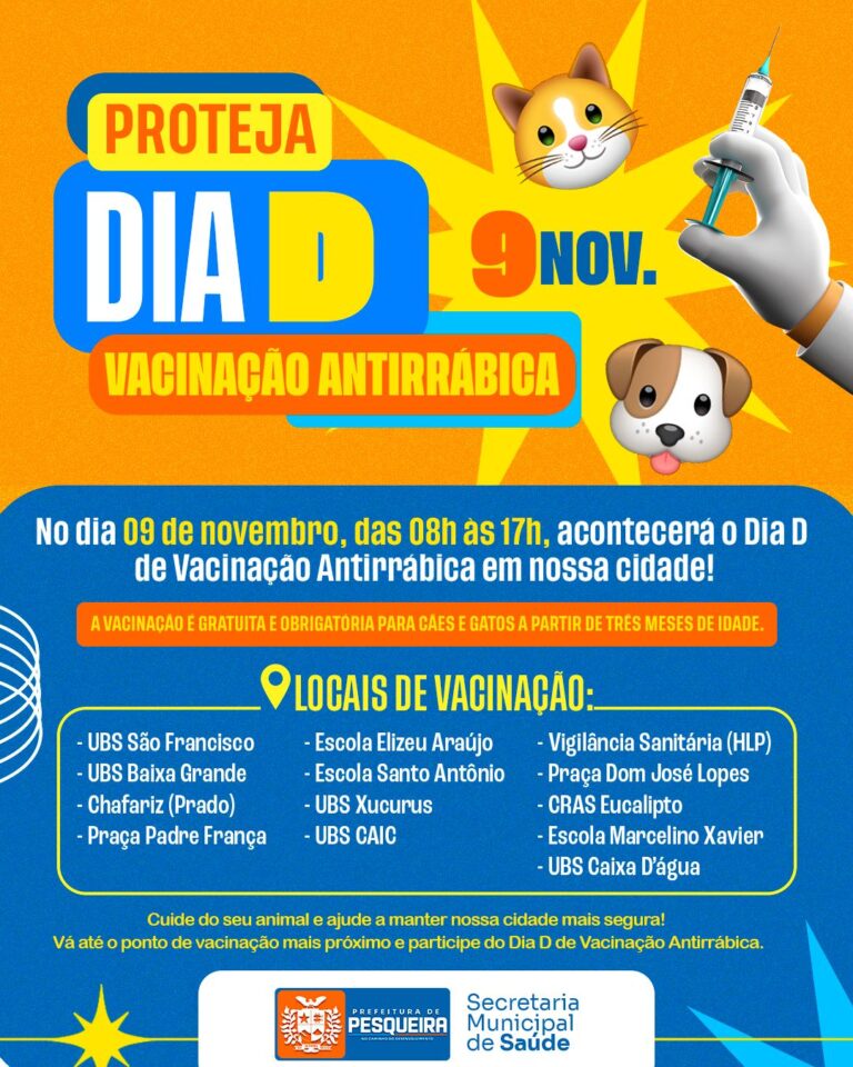 No dia 09 de novembro, das 08h às 17h, acontecerá o Dia D de Vacinação Antirrábica em nossa cidade!