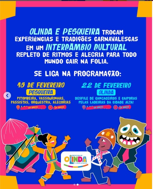 – Dia 15 de fevereiro, Olinda chega em Pesqueira com Frevo, Maracatu, Ciranda, Coco e Caboclinhos.