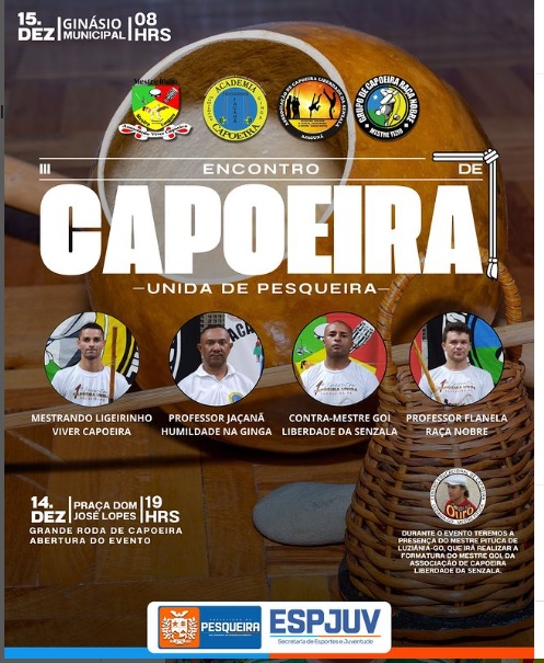 A Prefeitura de Pesqueira, através da Secretaria de Esportes e Juventude em parceria com a Associação de Capoeira Liberdade da Senzala, Academia Humildade na Ginga, Grupo de Capoeira Raça Nobre e a Associação Viver Capoeira realizará no dia 15 de dezembro, a partir das 08h da manhã, no Ginásio Municipal Geraldo Majela o III Encontro de Capoeira Unida de Pesqueira.