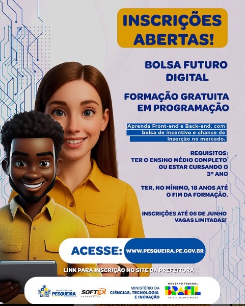 Estão abertas as inscrições para o programa Bolsa Futuro Digital, uma formação gratuita em programação com bolsa de incentivo e chance de inserção no mercado de tecnologia. 💻