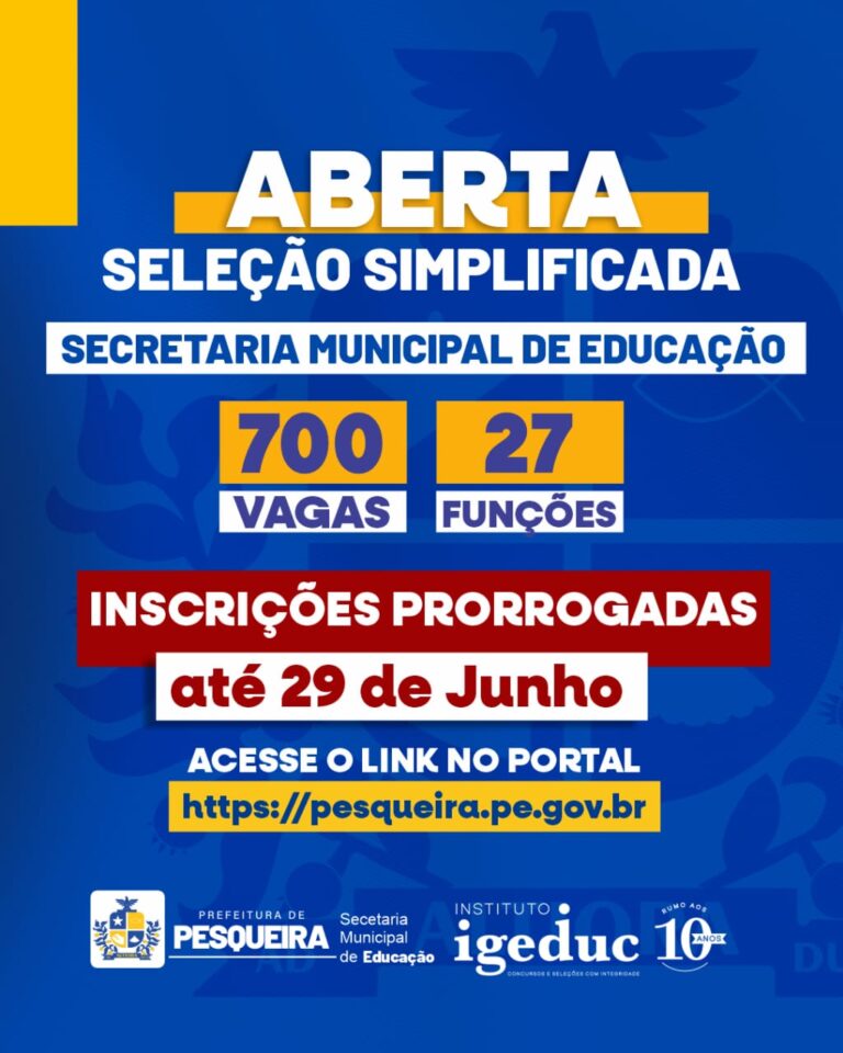 A Prefeitura de Pesqueira, por meio da Secretaria Municipal de Educação, informa que o prazo de inscrições para a Seleção Simplificada com 700 vagas foi prorrogado até o dia 29 de junho de 2025. A oportunidade é para diversas funções na rede municipal de ensino, por meio da organizadora IGEDUC.