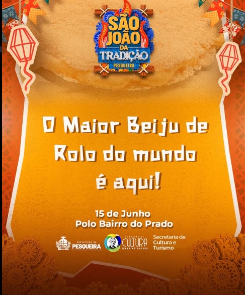 No dia 15 de junho, o Polo do Bairro do Prado será palco de um dos momentos mais especiais do nosso São João da Tradição: o Maior Beiju de Rolo do Mundo. 🪗