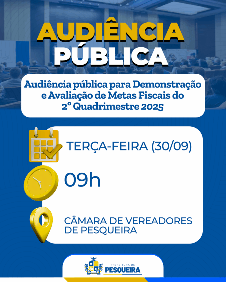 A Prefeitura de Pesqueira convoca a população para participar da Audiência Pública de Demonstração e Avaliação das Metas Fiscais referentes ao 2º Quadrimestre de 2025. O evento, fundamental para a transparência da gestão municipal, será realizado nesta terça-feira, 30 de setembro, na Câmara de Vereadores.
