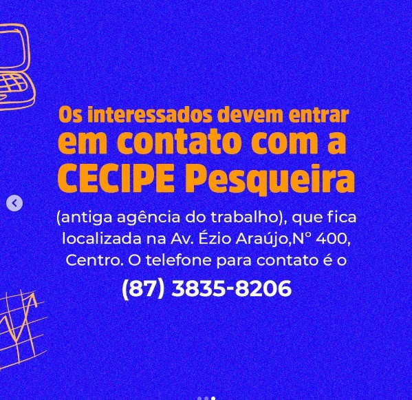 Os interessados devem procurar a CECIPE Pesqueira (antiga agência do trabalho), localizada na Av. Ézio Araújo, Nº 400, Centro.
