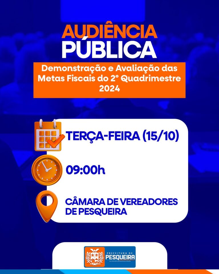 A Prefeitura de Pesqueira convida a população para participar da audiência pública para demonstração e avaliação das metas fiscais do 2º quadrimestre 2024, que será realizada a partir das 09h, da próxima terça-feira (15), na Câmara de Vereadores de Pesqueira.