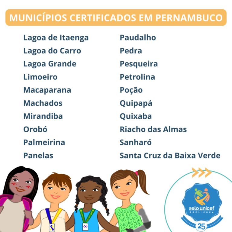 Neste ciclo 2021-2024, o Selo UNICEF fecha com um marco histórico para Pernambuco: dos 140 municípios que aderiram ao Selo, 81 se destacaram pela melhoria das políticas públicas voltadas para crianças e adolescentes e garantiram a certificação, estando PESQUEIRA, entre eles.