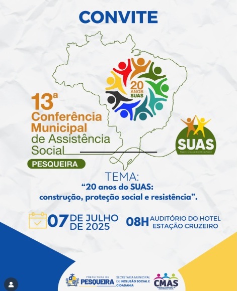 O Conselho Municipal de Assistência Social de Pesqueira, promove, no dia 07 de Julho de 2025, a 13ª Conferência Municipal de Assistência Social tem como tema central os “20 anos do SUAS: Construção, Proteção Social e Resistência” e visa discutir sobre o processo de melhoria do Sistema Único de Assistência Social (SUAS).