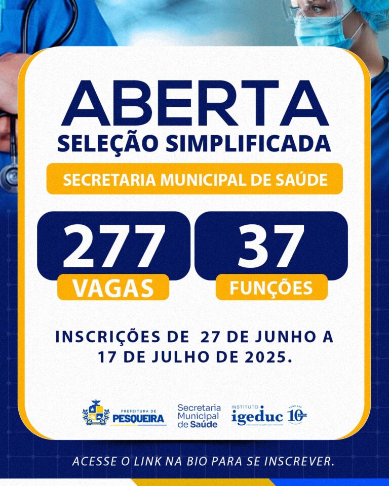 A Prefeitura Municipal de Pesqueira, por meio da Secretaria de Saúde, lançou oficialmente a Seleção Pública Simplificada para contratação de profissionais da área. Ao todo, estão sendo ofertadas 277 vagas, distribuídas entre 37 funções, contemplando os níveis fundamental, médio, técnico e superior.