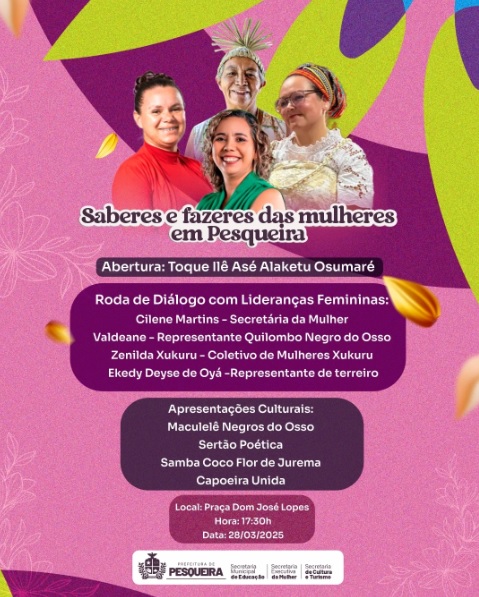 A força, a cultura e a ancestralidade das mulheres se destacam na ação Saberes e Fazeres das Mulheres em Pesqueira. Uma iniciativa da Secretaria de Educação, em parceria com as Secretarias Executivas da Mulher e de Cultura e Turismo, reunindo lideranças femininas para uma roda de diálogo e apresentações culturais que exaltam o protagonismo e os saberes das mulheres da nossa cidade.