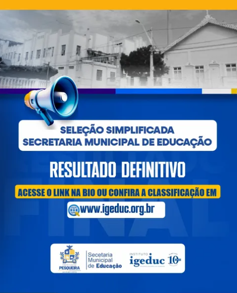 A Prefeitura de Pesqueira, através da Secretaria Municipal de Educação de Pesqueira informa que o resultado definitivo da Seleção Simplificada já está disponível para consulta no site www.igeduc.org.br. Os candidatos aprovados serão convocados de forma gradativa, por função, através de contato por telefone ou e-mail.